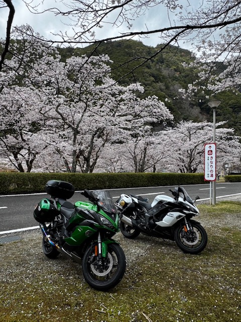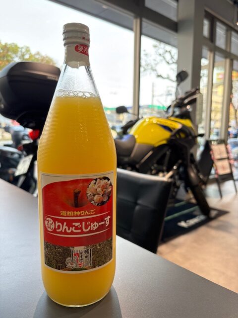 左のりんごジュースは、Vストローム650ご納車のお客様のお土産です。普段から長野と大阪をお仕事で行ったり来たり…長野の雄大な山々にVストは似合うだろうなぁ。少し時間がたって、仲良しニンジャのお二人がお花見をなさって戻るころ。